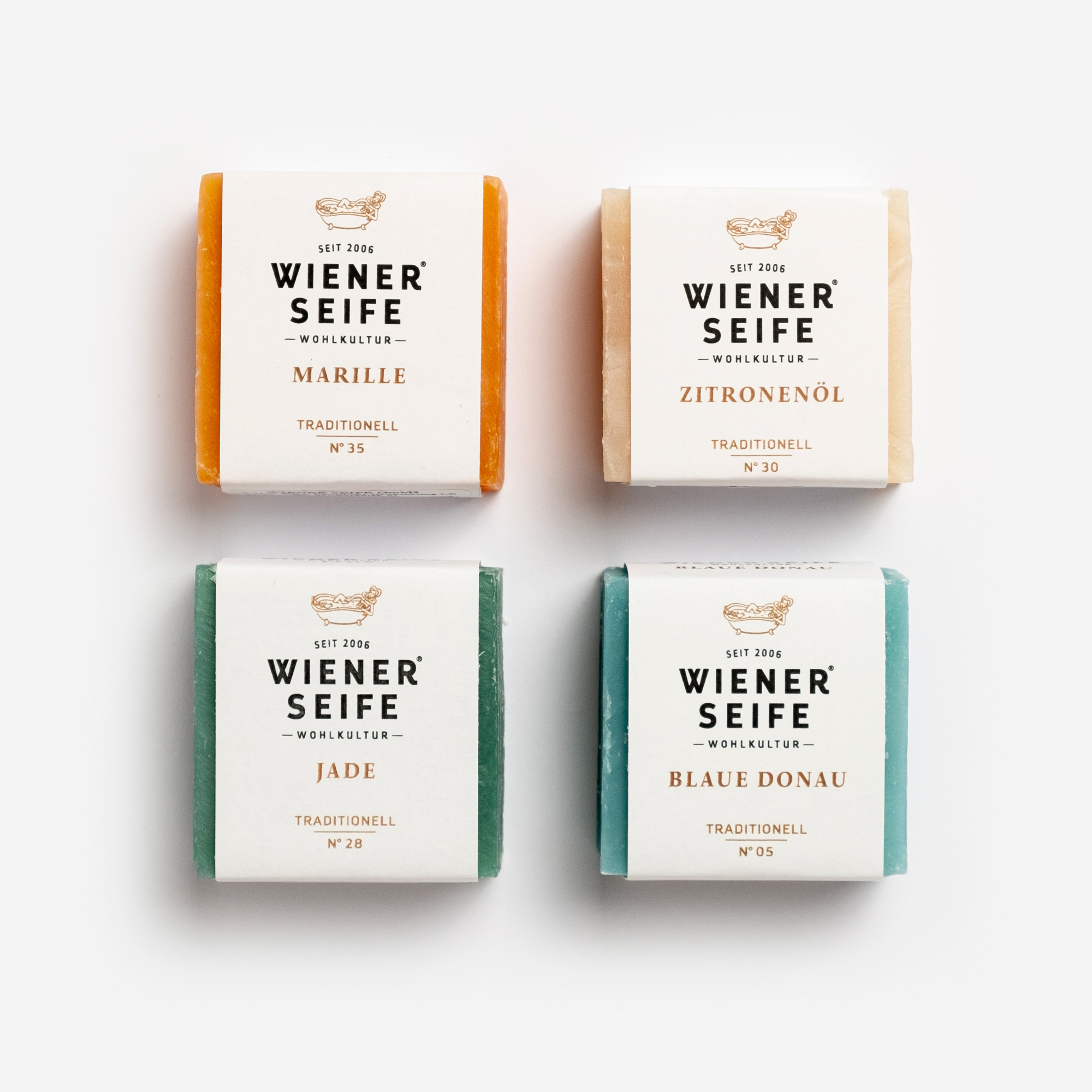 Fragrant refreshment for summer days: the scent of Mediterranean lemons, sweet and fruity apricots, a dive into the cool, blue Danube and the exotic gracefulness of our “Jade” soap, which reminds of balmy summer nights. Our new summer quartet unites four nourishing and summery mini soaps, for freshness and cleansing after swimming and sunbathing.