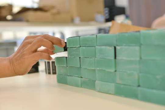The diligent hands of our colleagues in the soap-cutting and packaging departments are to thank for the beautiful and “well-dressed” presentation of our soaps. They enjoy the comfortable working atmosphere and the daily changing fragrances in the manufactory.